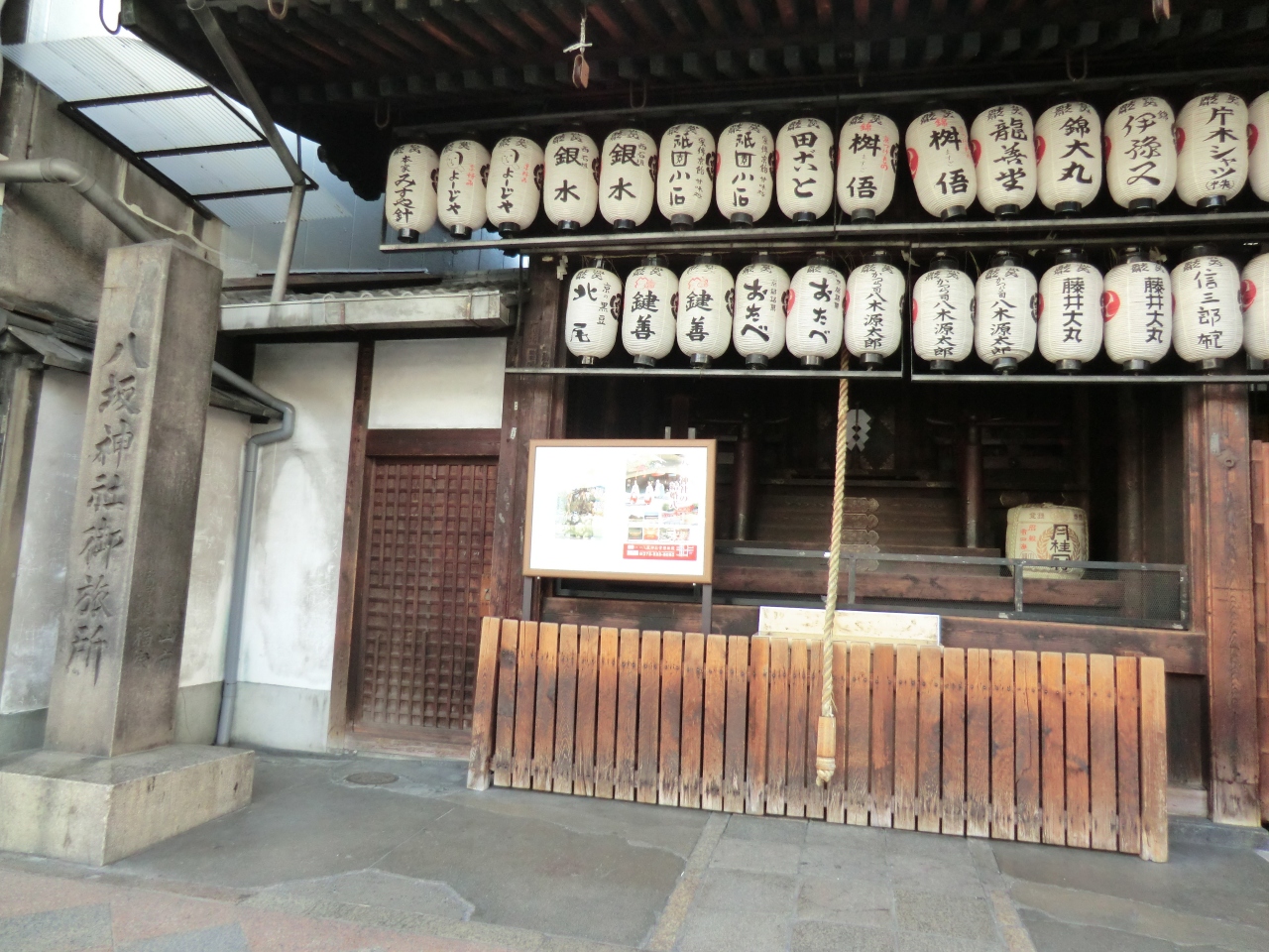 四条河原町の南側の歩道沿いにあります。八坂神社の御旅所は元々二か所あったそうですが、豊臣秀吉がひとつにして現在の場所に移転させたそうです。お社には京都の有名な会社やお店から奉納された提灯がさがっていました。