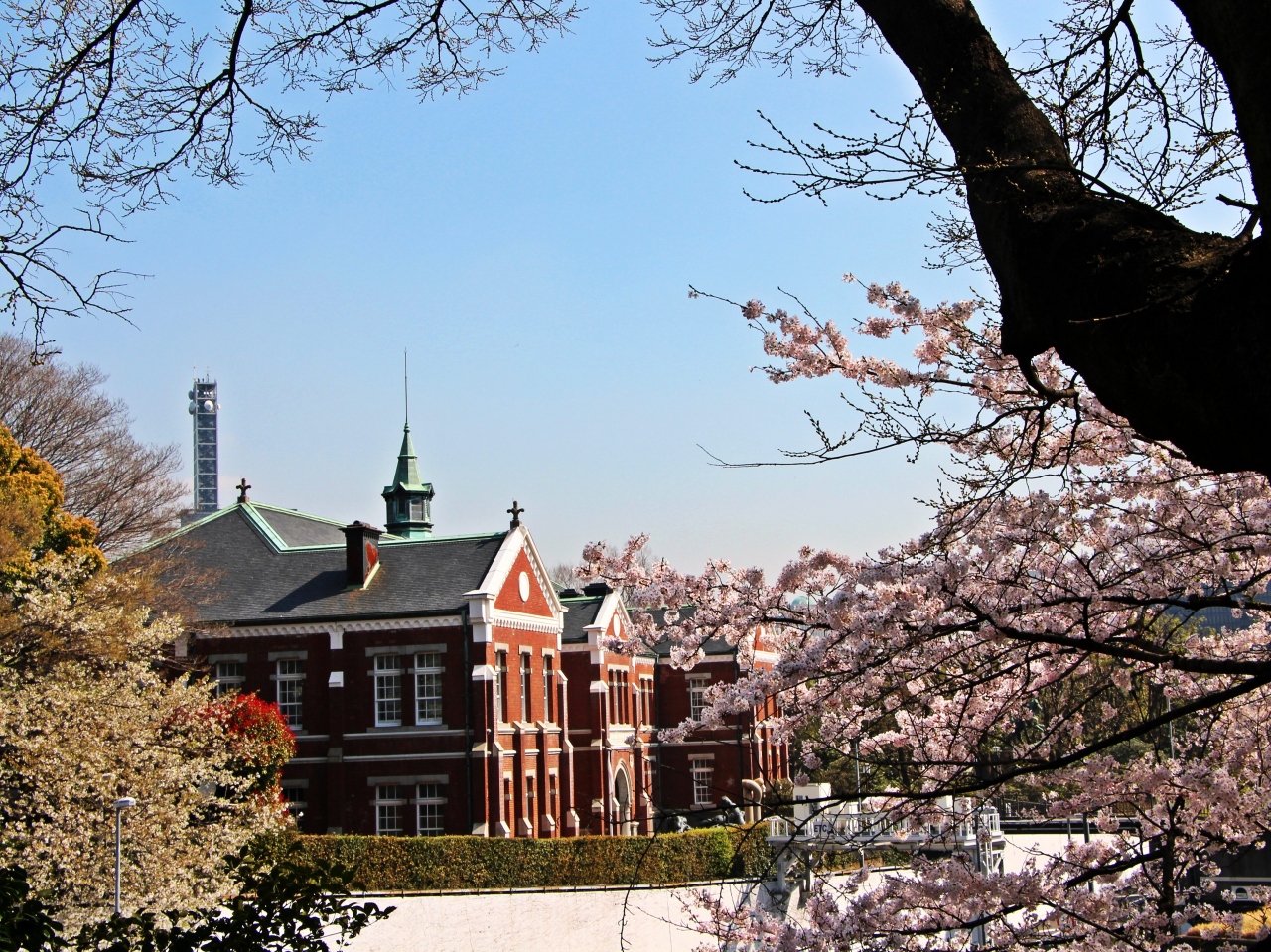 桜色の風景の中に浮かびあがるゴシック建築の東京国立近代美術館工芸館。