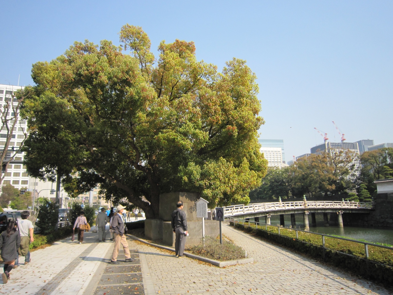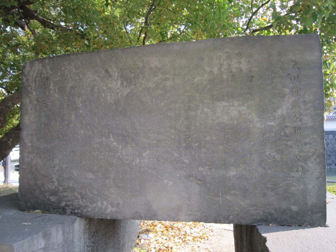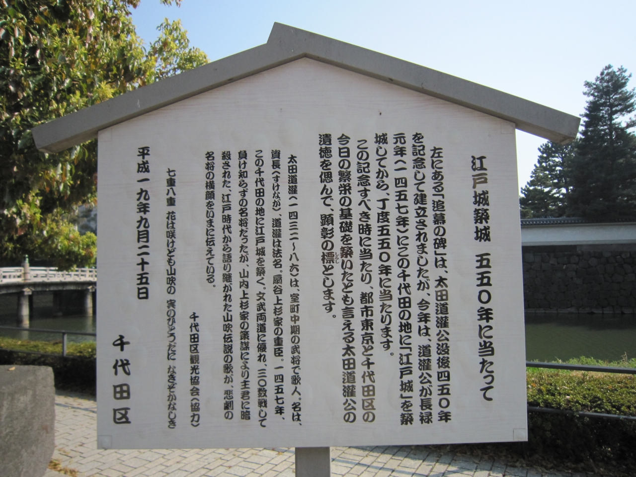 江戸城を築城した太田道灌没後450年の昭和11年に追慕石碑を建立、平成19年江戸城築城550年を記念し顕彰の標としたと説明板にありました。石碑に刻まれている字は難しくて分かりません。千代田区の説明板で分かりました。平川門、平川橋の直ぐ横です。大きな木の下に石碑があり、時々説明板を見る人がいました。