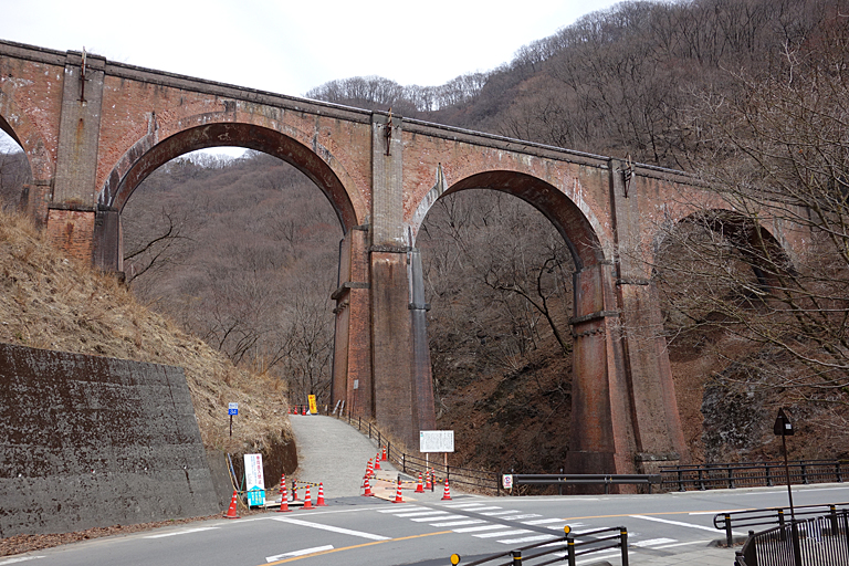 軽井沢から碓氷峠を越える最中にあります。この他にもアーチ型の橋がいくつか見られ、そのたびに車を止めて写真を撮りましたが、サンドフライのような虫の大群に襲われて、辟易しました。このめがね橋の周辺にはいませんでした。