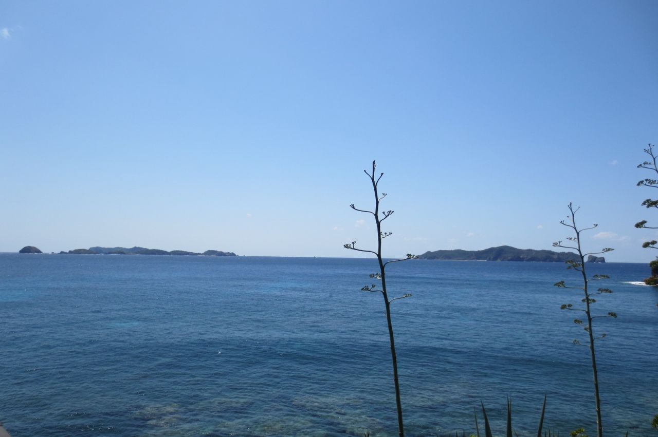 帰りは休憩所のすぐ後ろの(来た道ではない)の道に進むと舗道の道に出ます。途中、旧ヘリポートを左に見ながら歩いていくと往きにあったテニスコートのそばに出ますのでそこからは来た坂道を下り沖港へと戻れます。