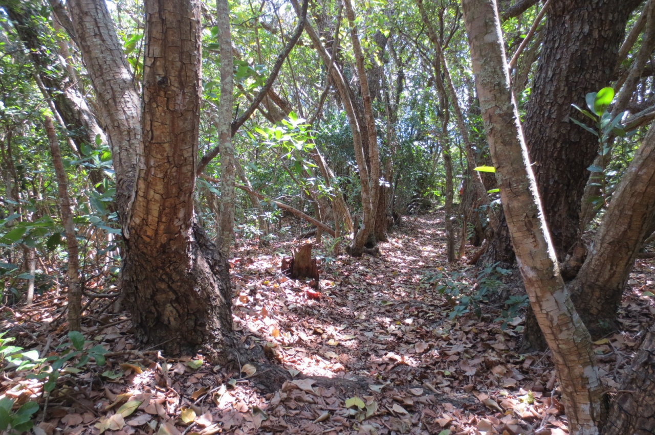 沖港から結構きつい上りの自動車道脇の歩道を約20分くらい歩くとテニスコートが見えてきます。そこを右折して評議平グラウンドのある前の道を行きます。(標識があるのでわかりやすいです)その脇道をしばらく歩くとタマナ(テリハボク)のトンネル並木があります。とても雰囲気がいい並木です。この遊歩道の途中に御幸浜の海岸に降りる道がありますので、海岸に出る場合はここから降ります。元の道をもう少し進むと御幸記念碑・展望台があります。シュロッパ(オガサワラビロウ)葺きの休憩所があります。そのすぐ前には展望台があり、ホエールウォッチングのポイントです。この時期はザトウクジラが見られるのですが、残念なことに見つけられませんでした。
