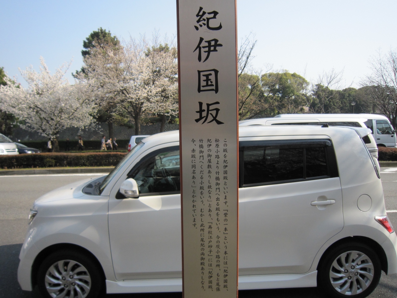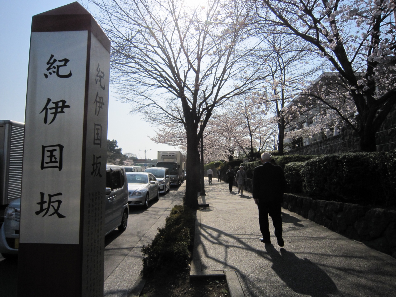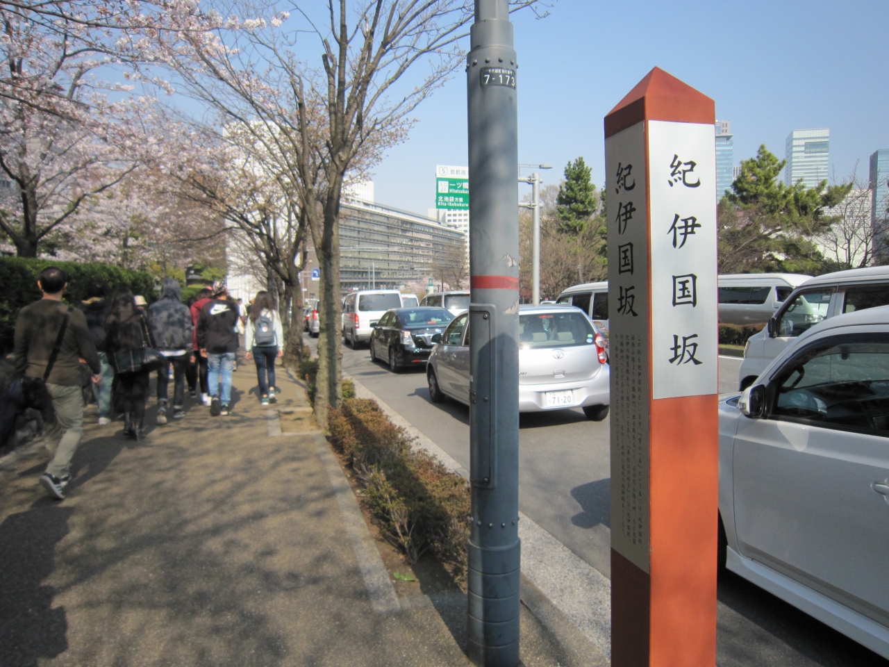 内堀通りを竹橋から国立近代美術館・国立公文書館の前を、北桔橋門前あたりまで上る緩やかな坂です。国立近代美術館前に紀伊国坂の標柱があります。車の量は多いです。竹橋駅から北の丸公園へ行く人で賑わいますが、九段下駅から行くよりも混みません。両脇の歩道は桜が咲き綺麗です。