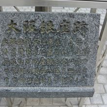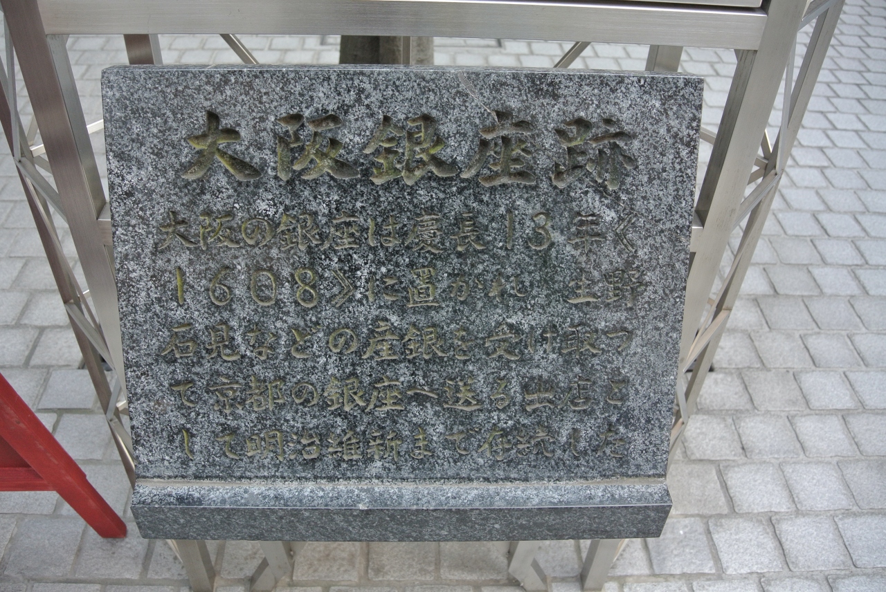 大阪は銅座のイメージが強かったのですが、考えて見れば、生野や石見といった銀の主要産地は江戸より大坂のほうが近いですから、大坂に銀座があっても不思議はないですね。大坂銀座跡を示す石板は高麗橋より少し東に行ったところにあります。