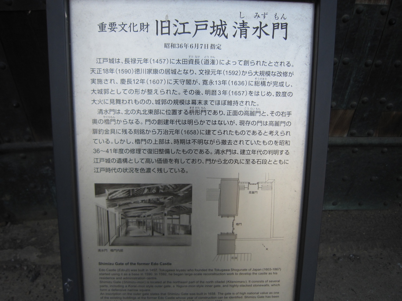 地下鉄九段下駅と竹橋駅の間、千代田区役所の向いから入ります。田安門と共に重要文化財、枡形門で正面の高麗門、右手奥の櫓門からなっており、江戸城の遺構として高い価値があるそうです。貴重な建造物です。門から北の丸へ至る石段と共に江戸時代を感じさせます。これまで石段を何回も上り下りし通りましたが結構きついです。桜の咲いた時期でもあるのですが、若干人通りが多かったですが田安門に比べると全然少ないです。ゆっくりと花見の見物が出来ます。武道館でコンサート等の帰りは清水門を通り九段下駅に行くのが早いです。ただ石段が不規則で段差があり暗い時は気を付けなければなりません。