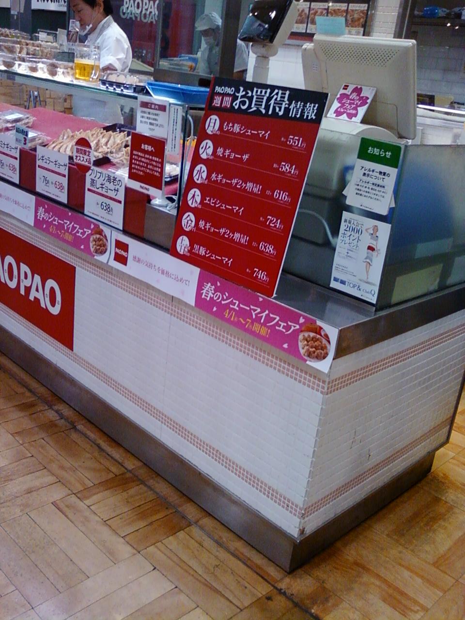ここのPAOPAOさんは、東急線日吉駅に隣接している日吉東急アベニューの一階、フードフロアーにあります。餃子、水餃子、肉まん、あんまんなどを販売しているお店で、どれもおいしそうです。曜日によってお買い得な内容が変わります。肉まんをいただきましたが、皮もしっかり、お肉もたくさん詰まっていれ、大満足です。