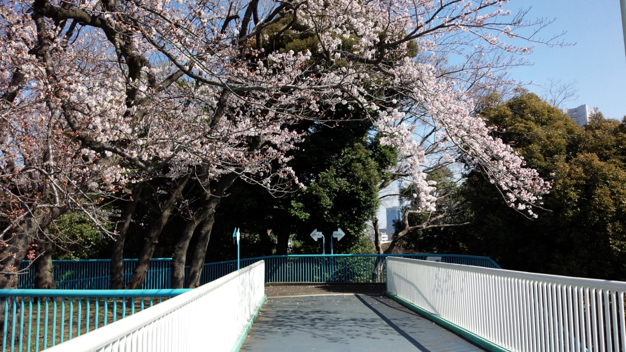 桜の花が木漏れ日の間をピンク色に染め本当に美しい光景です。遊歩道から動物園へ向かいその陸橋の脇の桜はまだ六部咲きぐらいでした。野毛山広場に向かう橋のうえからはうっすらと富士山も見えました。ずっと広場に向かって散歩しましたがやはりほぼ満開。
