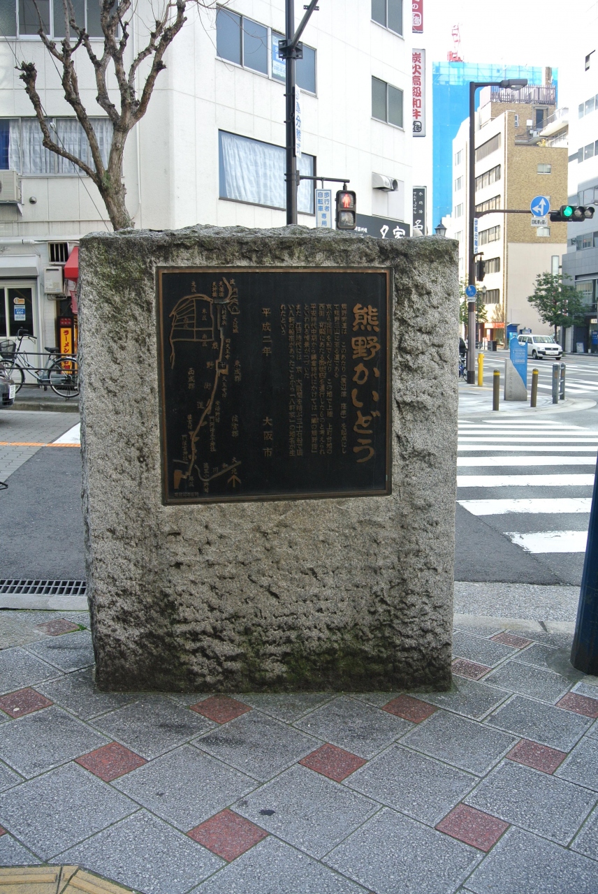 熊野街道は熊野三山への参詣に利用された道のことですが、起点が天満橋のあたりにあったということで、大阪市による石板が設置されています。この石板にここから大和川あたりまでの道筋の地図が描いてありますが、「蟻の熊野詣」と言われたほど熊野参詣は盛んにおこなれたということです。