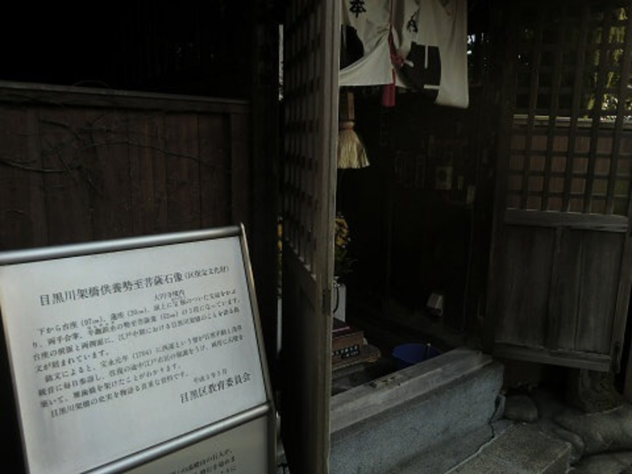 行人坂の途中、大円寺前に目黒川架橋供養勢至菩薩像が祀られる祠があり、この菩薩像の銘文には、西運が目黒不動と浅草観音に毎日参詣し、その途上で人々の浄財を受け目黒川の両岸に石壁を造り石製の太鼓橋を掛けたことが記されています。