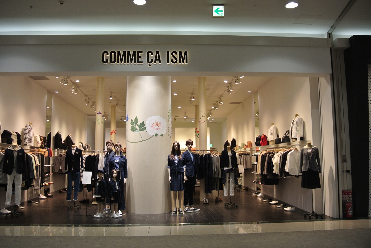 このお店は二階にあります。言わずと知れたコムサイズム。ファミリーでトータルコーディネイトできるスタイルです。色は黒、紺、白などが基本。そしてほとんどの服は無地で、柄物やチェック柄などというものはほとんどありません。