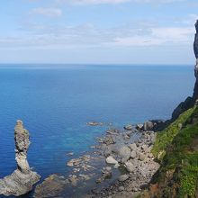 積丹岬の遊歩道の海岸沿いから見ることができる岩。着物を着て子供を背負った女性の姿に似ていることから名づけられた岩とのことで、まさにそのような形に見える。断崖絶壁の地形、積丹ブルーの海の色とあわせて絶景スポットだと思う。