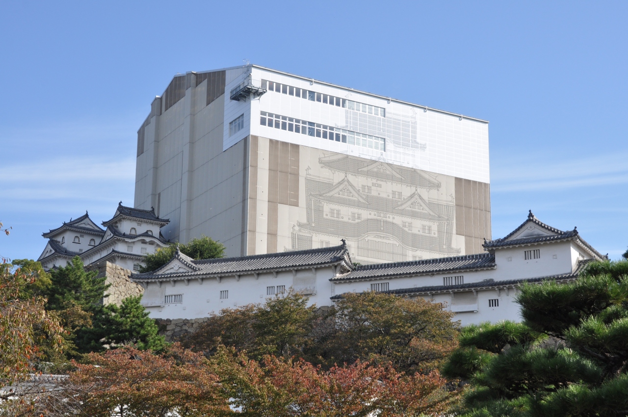 姫路城は昭和の大修理から約半世紀が過ぎ、大天守には傷みや汚れが目立ち、漆喰壁の塗り直しや屋根瓦の葺き直しを中心に約5年をかけて大規模工事が行われていた。当日は多少の待ち時間を覚悟したが、全く待たずに入れた。1階のウェイティングゾーンからエレベーターで8階まで登ると、大天守最上層の大屋根をガラス越しにかなり至近距離で見ることができた。7階からは漆喰壁を間近に見ることができた。展望スペースからは姫路市内のパノラマが広がり、西の丸の櫓群もきれいに見ることができた。エレベーターで下に下りていくと、石垣など手が届きそうな距離から見ることができた。なお1階のウェイティングゾーンやホールも含めて7階、8階には屋根瓦や修復作業のプロセス等の資料が展示されていたが、やはり実物には叶わない。「姫路城の屋根や壁面を間近に見られるのは修理期間中だけ」と自分に言い聞かせてきたが、やはり「大天守閣の全貌を見たかったなあ」というのが率直な感想。