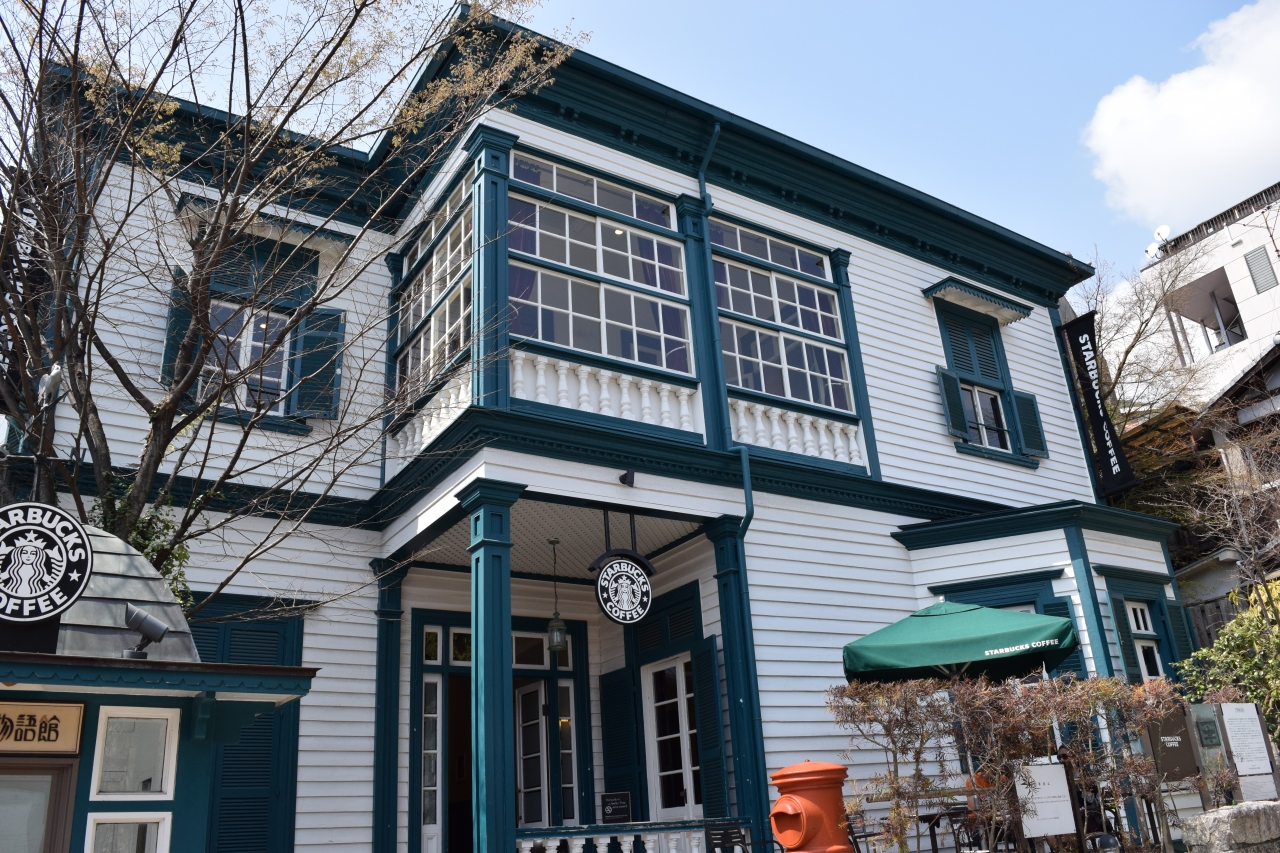 このスターバックス館の北野物語館は、1907年(明治40年)に建築された木造2階建ての住宅で、建築当初は米国人が所有していたもので1995年(平成7年)の阪神・淡路大震災の被害を受けた後、取り壊される予定でしたが、神戸市が建物の寄贈を受けた上で解体・部材保管し、その後、民間事業者に部材を譲渡して、平成13年に現在地に再建・移築されたものです。