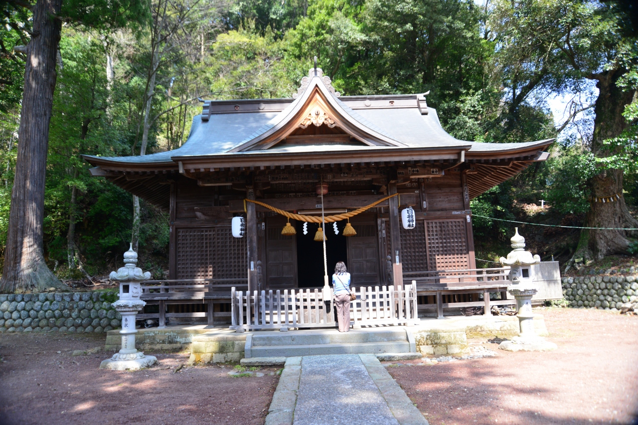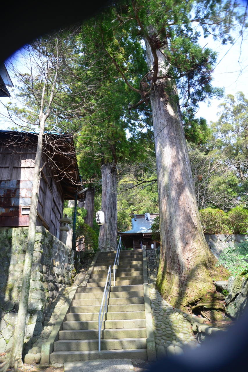 修禅寺のすぐ右隣にありますが、多くの人が訪れる修禅寺に比べてこの神社を訪れる人は少ないようで、静かな佇まいでした。境内にはスギ、カシ、ケヤキなどの巨木が多く、本殿左側に寄り添って立つ二本の杉の木は、その間を通ると子宝に恵まれるという言い伝えがあるそうです。