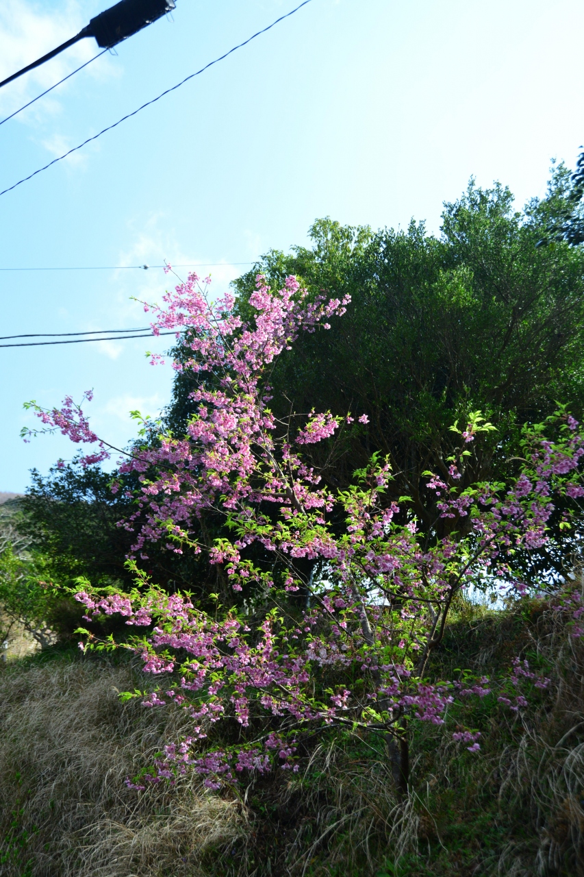 河津川沿いの桜並木は葉桜になっていましたが、それ以外のところではまだまだ見ごろのところもありました。ふつうよく見かけるソメイヨシノの薄いピンクと違って濃いピンク色が特徴です。この早咲きの桜の原木が河津町にあることから河津桜と名付けられています。