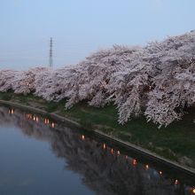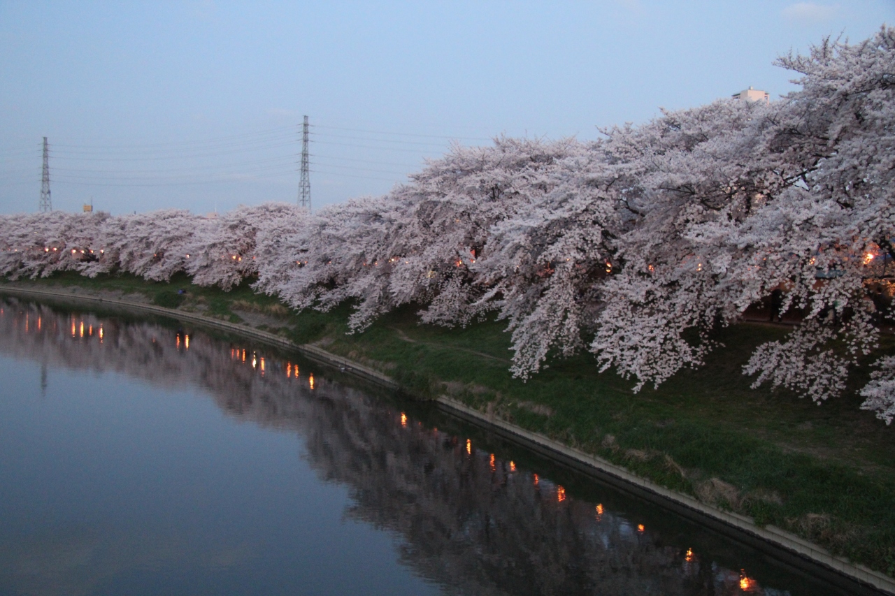 幸手権現堂桜堤からの帰路立ち寄りました。東武日光線北越谷駅から徒歩10分程度です。元荒川の堤の桜並木は丁度満開でした。空いているのでゆっくりお花見が出来ます。(文教大学前は除く。ここは学生が大勢花見をいていました)大がかりなライトアップではありませんが、夜は提灯に灯りがともります。