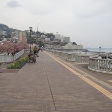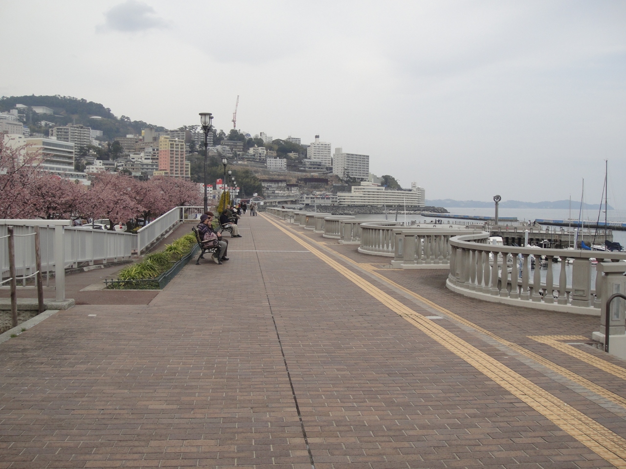 海岸沿いの親水公園は、きれいに整備されていてのんびり散歩するのにぴったりです。ムーンテラス、スカイデッキ、レインボーデッキと少しずつ異なる海の景色を楽しめます。3月半ばにはまだ熱海桜が残っていて、予想外にもお花見が楽しめました。