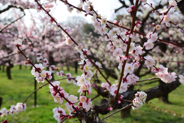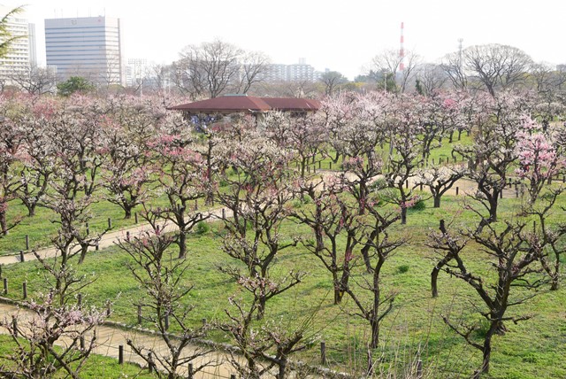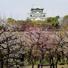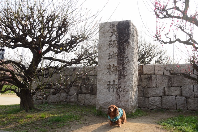 梅林へ向かうと、高台から全景写真を撮ることができます。大阪城は天守閣内以外は、ペット同伴可ですが、梅林も例外ではありません。シーズン中は、すごい人手になるので、できるだけ、早朝に訪問するのポイントです。