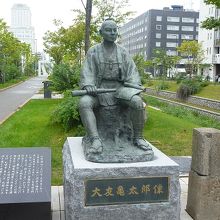 札幌の中心部を南北に流れる創成川。現在川沿いは公園として整備されていて、川沿いの道を歩けるようになっている。その一角にある大友亀太郎像は札幌開拓の発端となった人物で、大友堀を開削している。現在の札幌の街並みを形成する端緒となった人物として創成川のほとりにたたずんでいる。