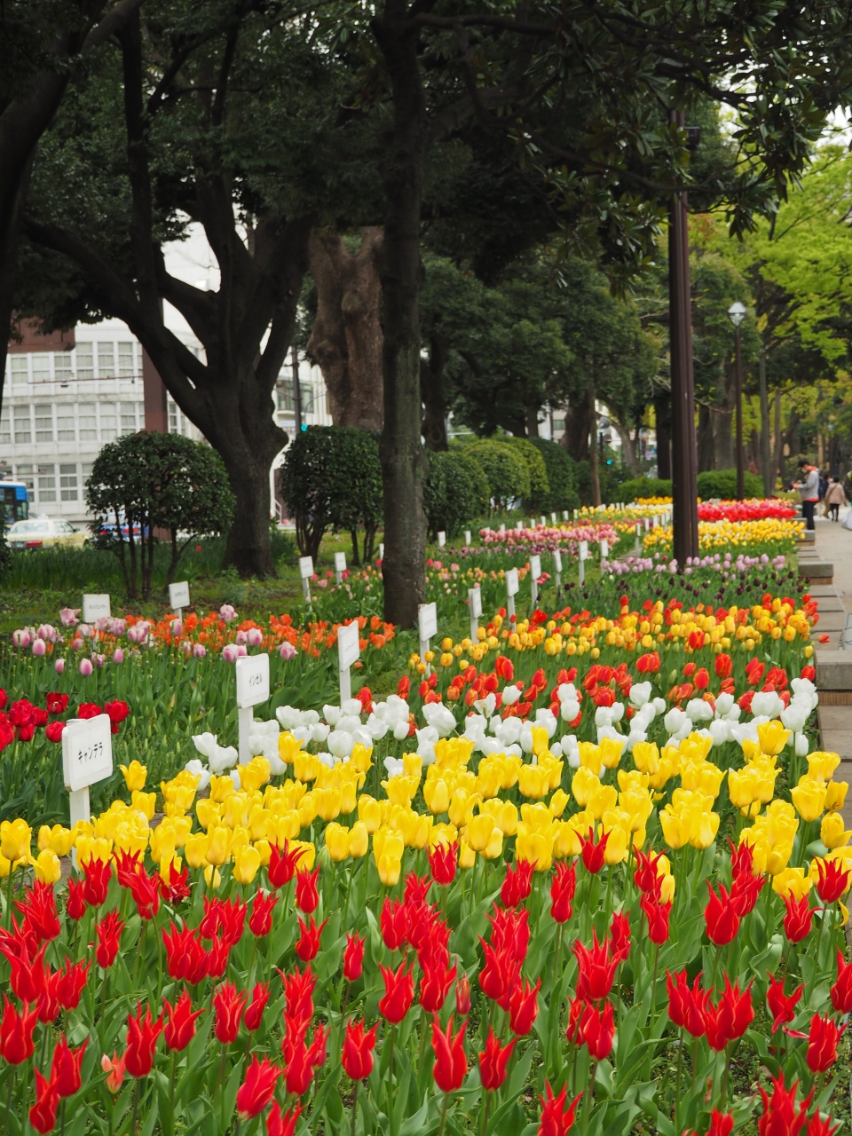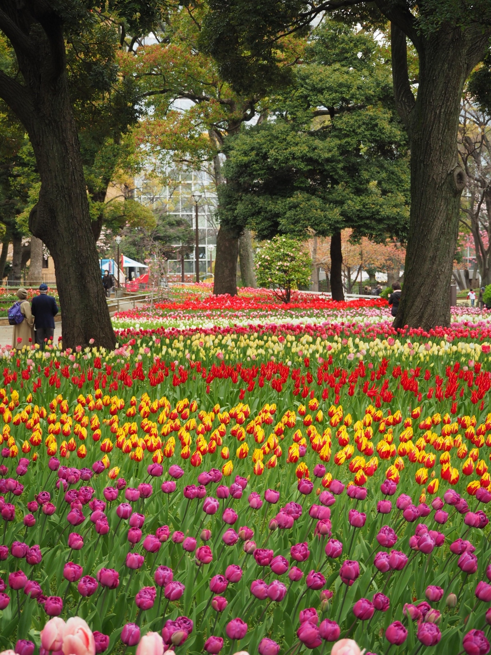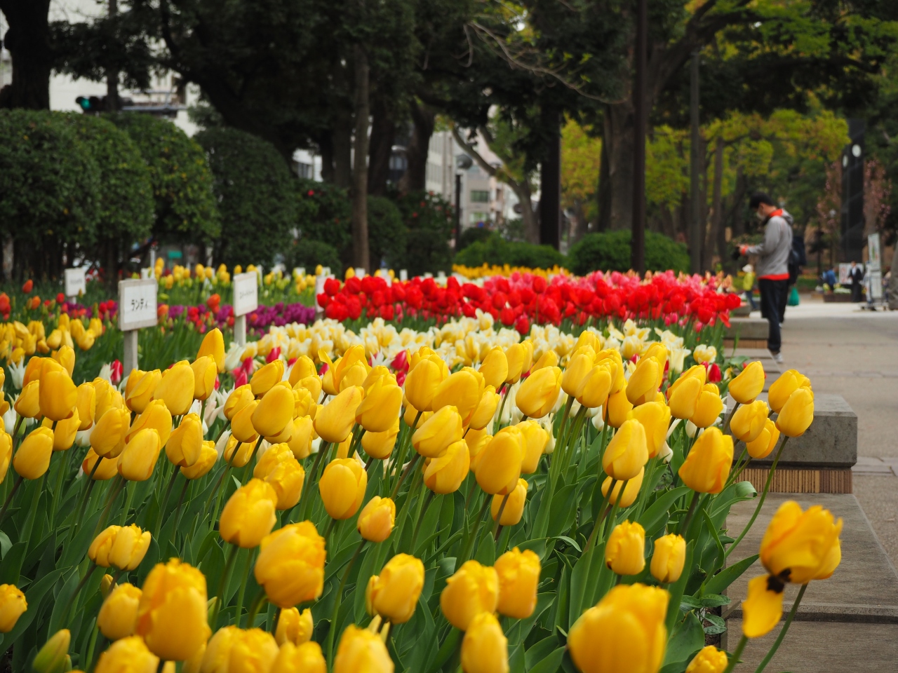 横浜公園の春を彩る16万本のチューリップが見頃になりました~。2015.04.04現在まだ固い蕾のものもありますが全体の7~8割が開花。例年より少し早い位でしょうか。この後1週間ほどでピークを迎えしばらく見頃が続きそうです。