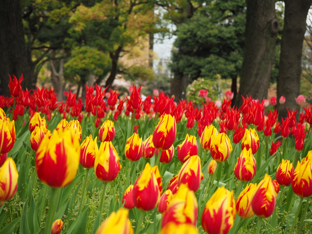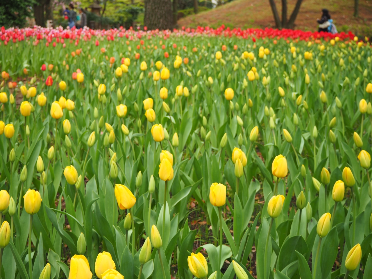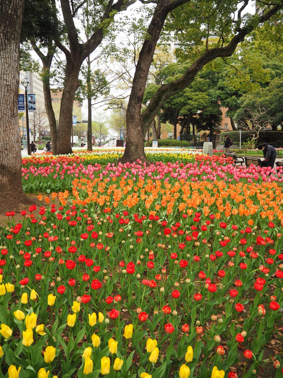 横浜公園の春を彩る16万本のチューリップが見頃になりました~。2015.04.04現在まだ固い蕾のものもありますが全体の7~8割が開花。例年より少し早い位でしょうか。この後1週間ほどでピークを迎えしばらく見頃が続きそうです。