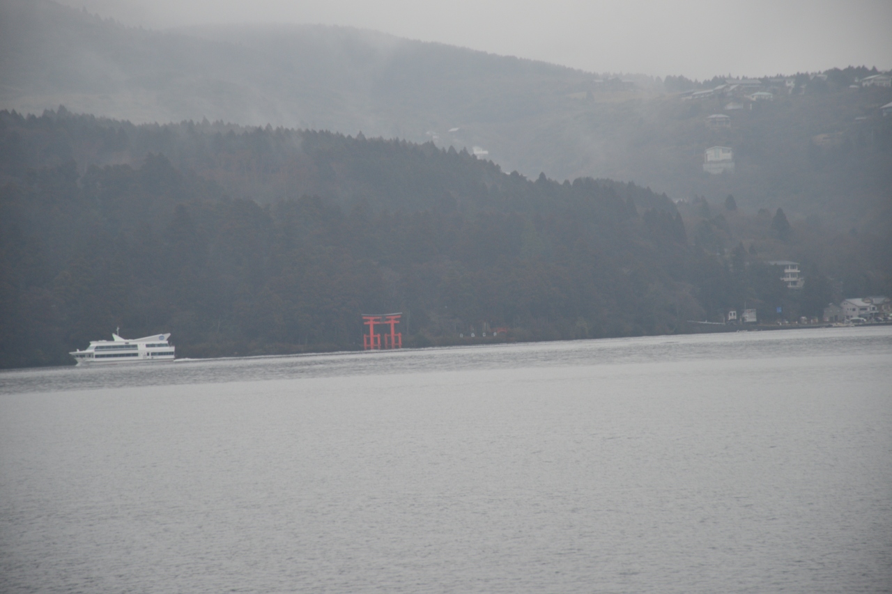 雨が降っており、富士山を見ることはできませんでしたが、 霧が山々にかかる芦ノ湖の景色もそれはそれで幻想的で風情があってよかったです。遊覧船も色々な船、コースがあるようですが、双胴船で箱根関所港から元箱根港までの短いコースの遊覧をしました。