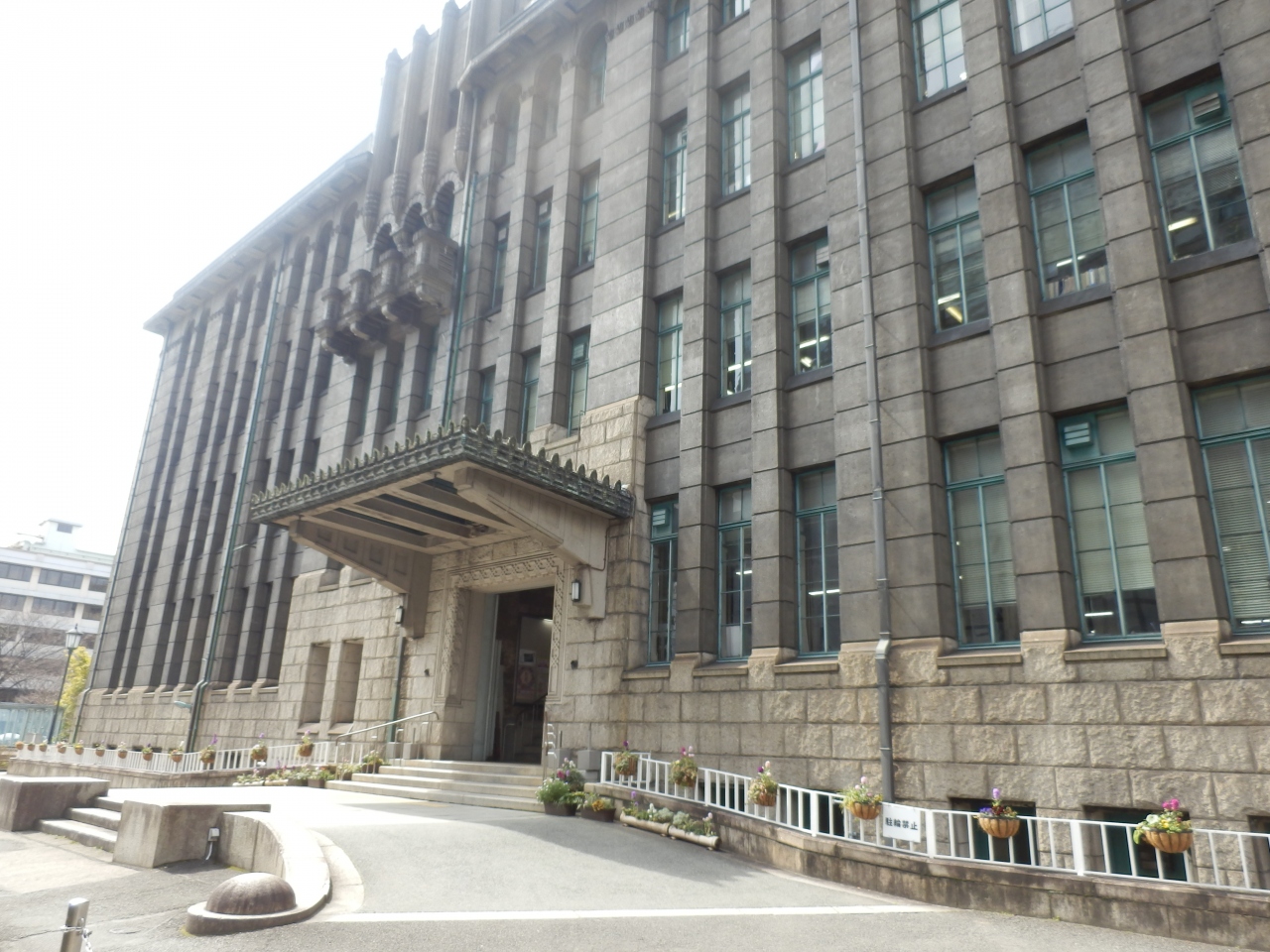 京都市内でのレトロなビル、三条通には、日本銀行京都支店、旧第一銀行京都支店、など沢山残っており今日までに散策終了した、市役所は三条通より南約1KM程度?離れていますが地下鉄市役所前で下車、地上に出るとすぐ前にあります、四条河原町からは寺町通又は新京極通を散策しながら北方向へ徒歩15分〜20分、横に広く手を広げた感じ、両手を真ん中でまとめるのに出っ張りが全体の調和を保つのに役立っているようだ、、