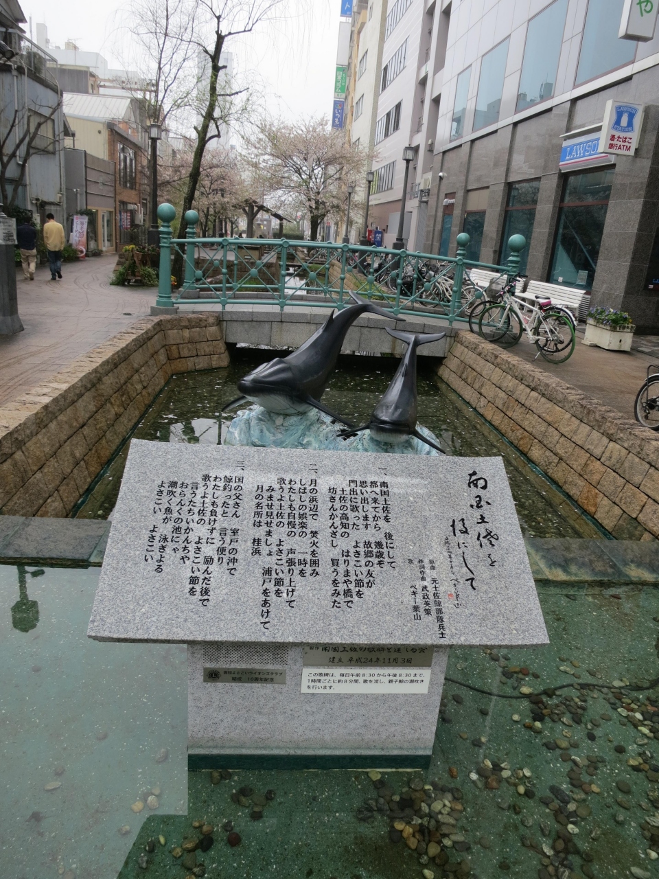 はりまや橋商店街とデンテツターミナルビルの間、はりまや橋公園の流れの中に、「南国土佐を後にして」の歌碑と親子鯨の石像があります。「南国土佐を後にして」は、日中戦争時に高知県出身者で編成された鯨部隊が戦地で歌った望郷の歌が原曲で、ペギー葉山が1959年に歌って大ヒットし、高知県の観光客誘致にも貢献したそうです。この碑は、全国から集まった約1600万円の寄付金で建立され、毎日8:30~20:30まで1時間毎に約8分間歌が流れ、親子鯨が潮吹きをするそうです。高知の街歩きの際に楽しみたいスポットです。