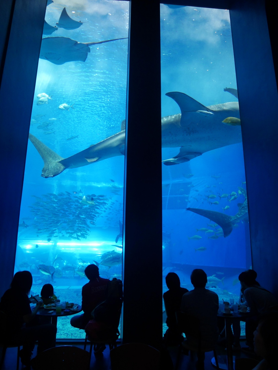 美ら海水族館のメイン水槽である黒潮の海を寛いで堪能するならカフェオーシャンブルーへ。