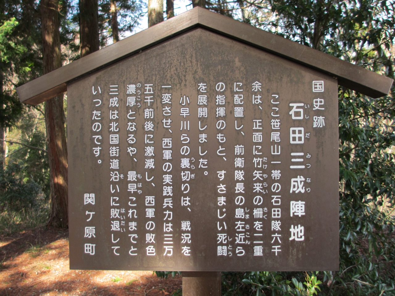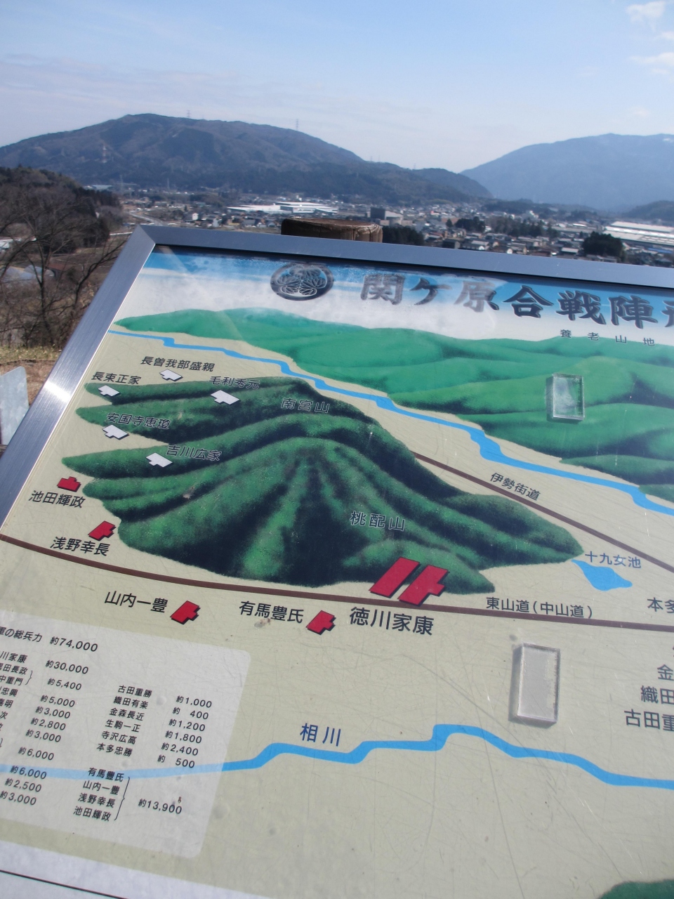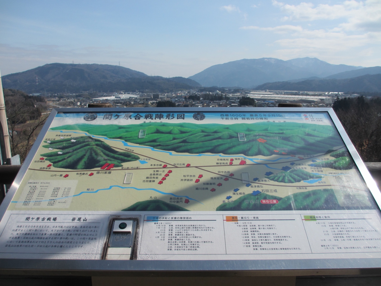 展望台からは関ヶ原が見渡せ、土の山に誰の陣営があったなどが書いてある看板や、
