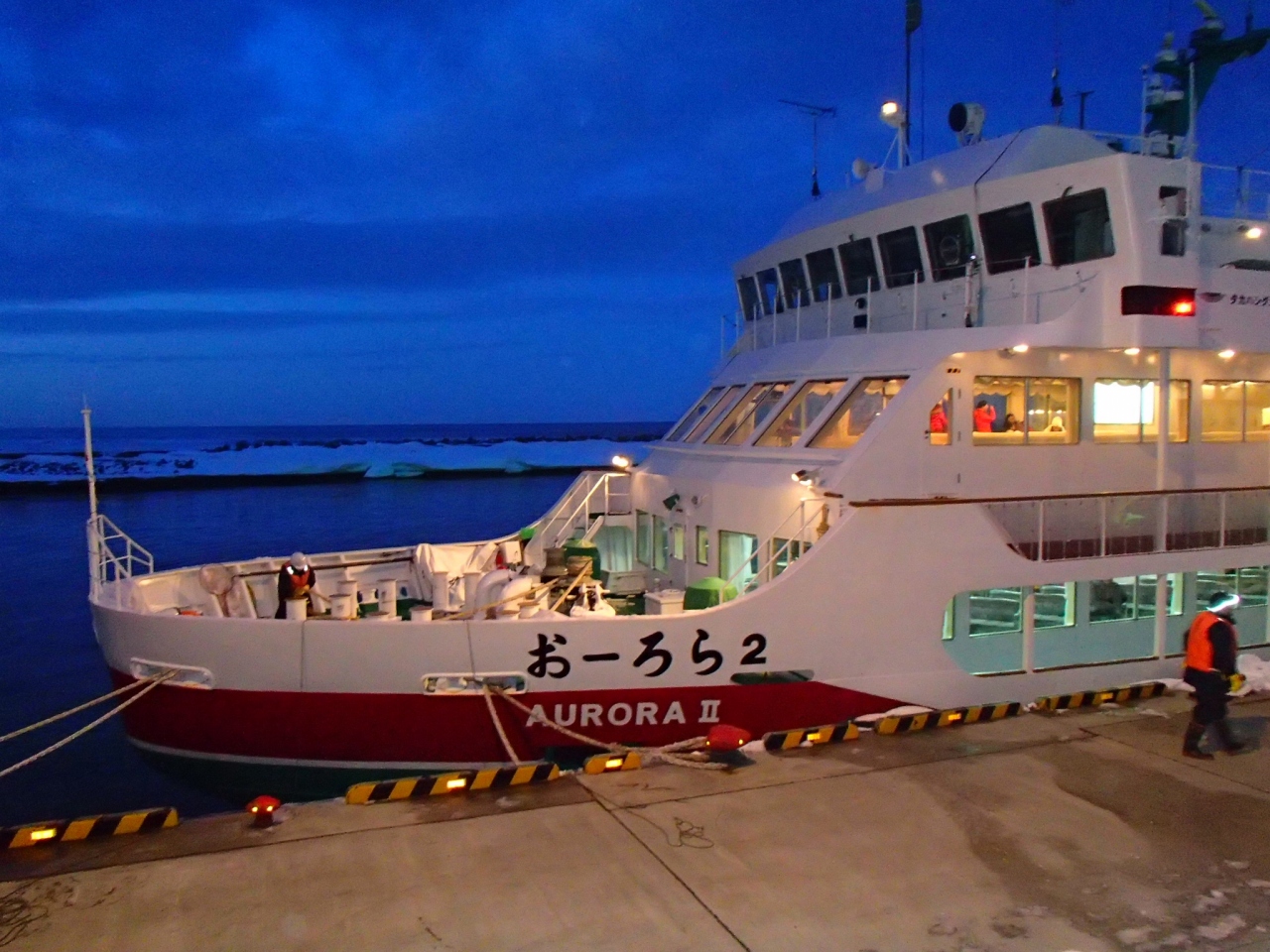 乗客は中国や韓国からの観光客が8割ぐらいだったかと思います。船内も外のデッキも大混雑でした。前日まで悪天候で欠航だったので出航するか心配でしたが、この日は海況も回復し、見事な流氷を望むことができました。あるところを境に流氷で埋め尽くされる海は圧巻でした。船内からも見ることはできますが、寒さを我慢して外のデッキからのほうがお勧めです。この時に限ったことかもしれませんが、船内が大混雑だったので乗船人数をもう少し制限して欲しいです。