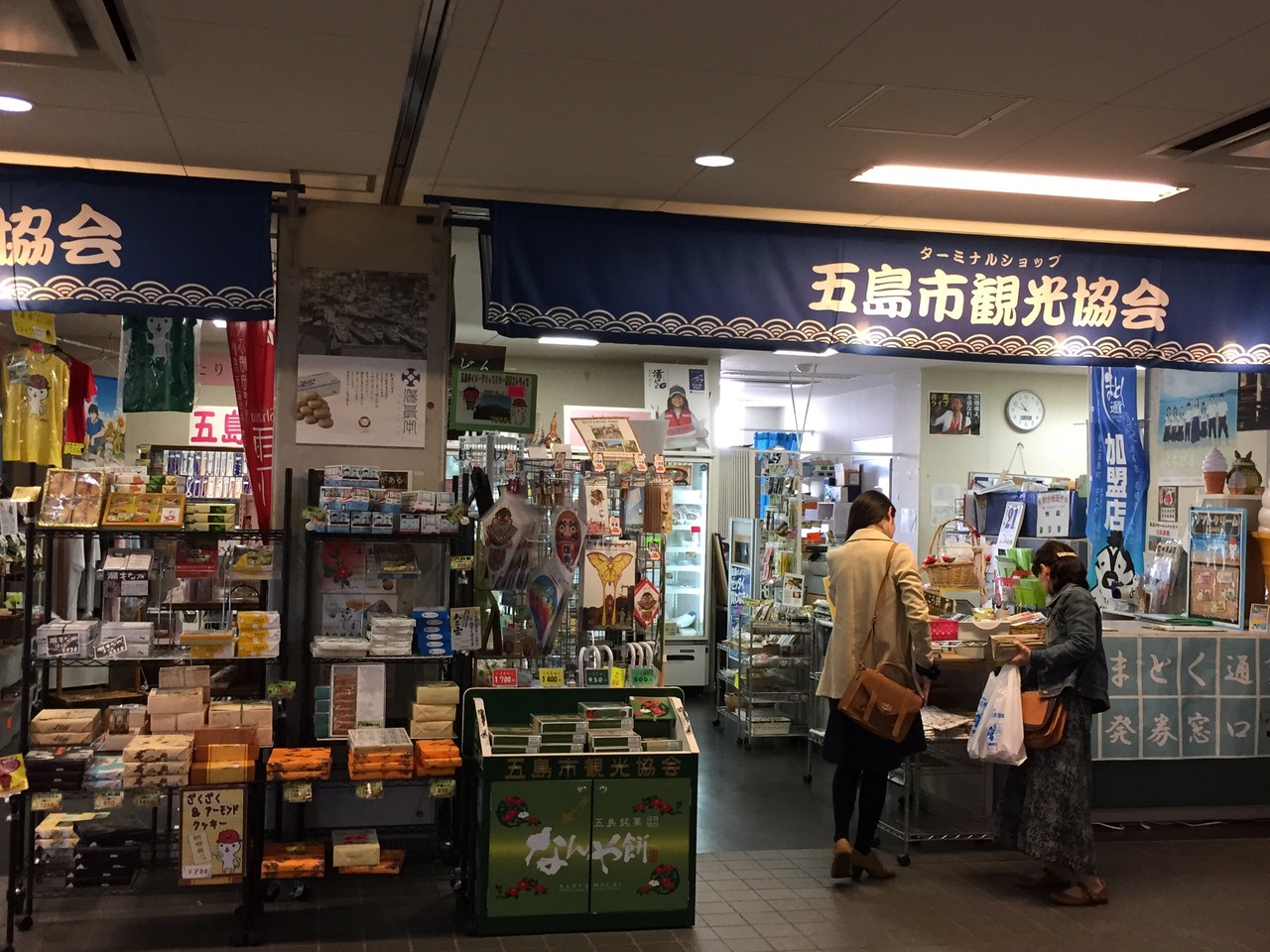 フェリーやジェットホイルなどで、来た場合には、必ず利用する場所です。観光ガイドブックなどもありますし、五島の名産などもたくさん置いてあります。天皇陛下に献上したお菓子も隣の店で売っていました。長崎空港で買おうと思ったらなかったです。