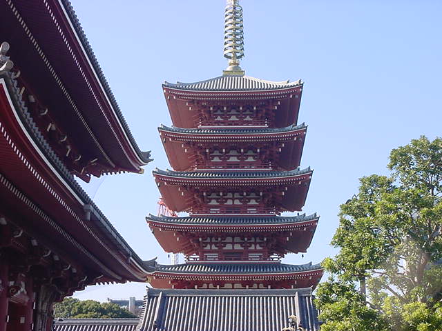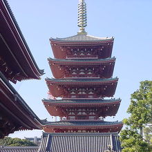 外国人も多く訪れる観光地、浅草の「浅草寺」境内にある五重塔。宝蔵門の手前からもよく見えていますが、真下まで行くとその高さを実感します。京都の東寺に次いで高い五重塔です。戦争で焼失したものを再建したものですが、浅草のシンボル的存在になっています。