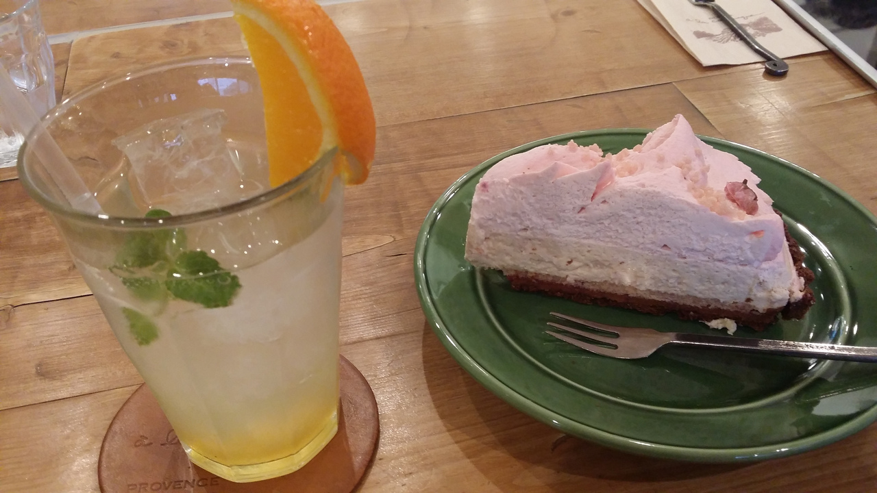 サクラのタルトとフルーツの炭酸ジュースを注文しました。サクラのタルトは見た目が可愛かったので思わず注文しましたが、ムース部分がサクラの味がして濃厚でとても美味しかったです。何となくスタバのサクラフラペチーノの味がしました。