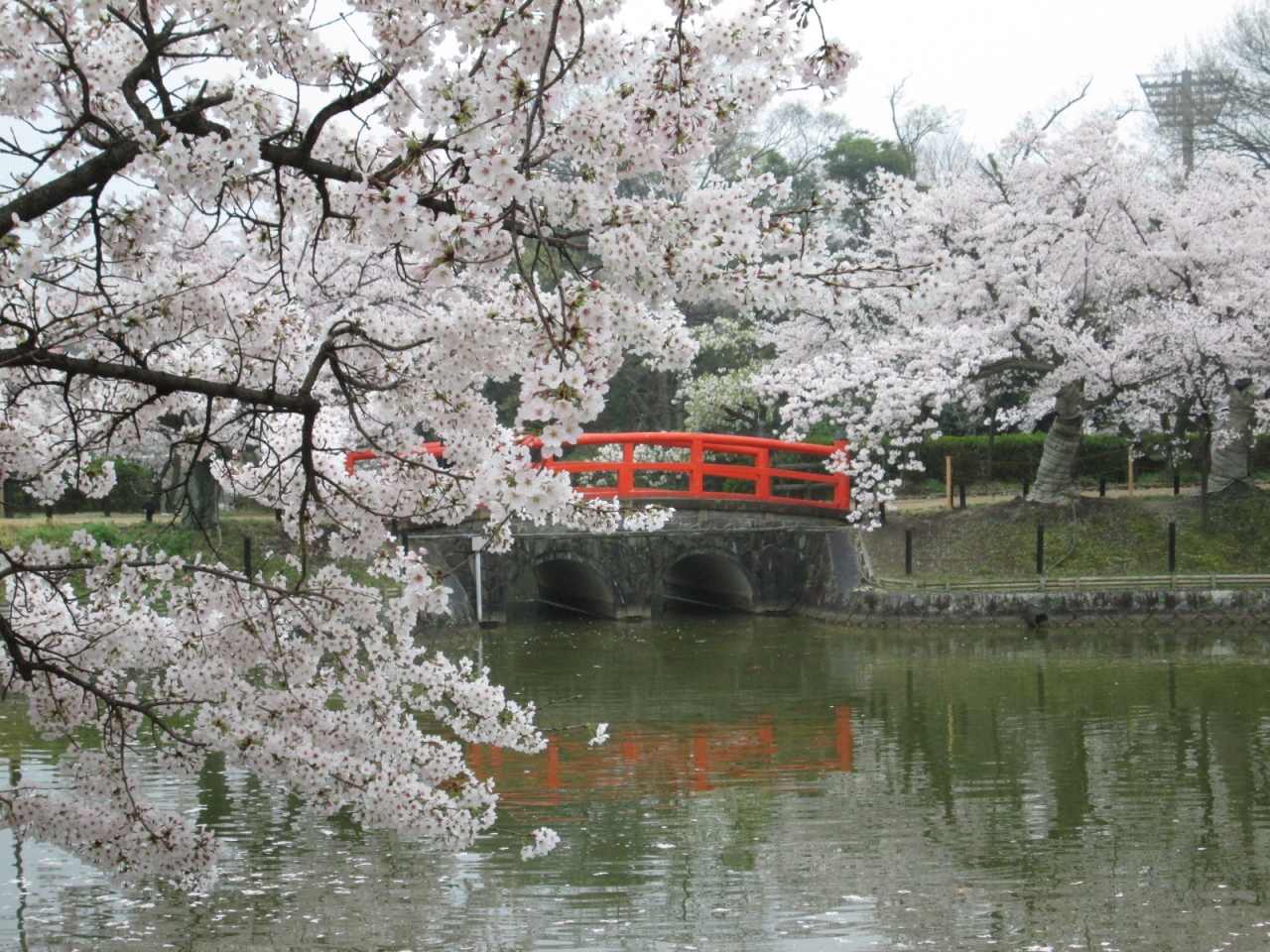 久しぶりに出かけてきました。小雨模様でしたが、桜の花びらに水滴が付き、晴れの桜とは違った姿を見ることができました。雨にも負けず出店の方々もがんばっていました。池に架かる赤い橋と淡い桜のピンク色・・・一番のお気に入りです。