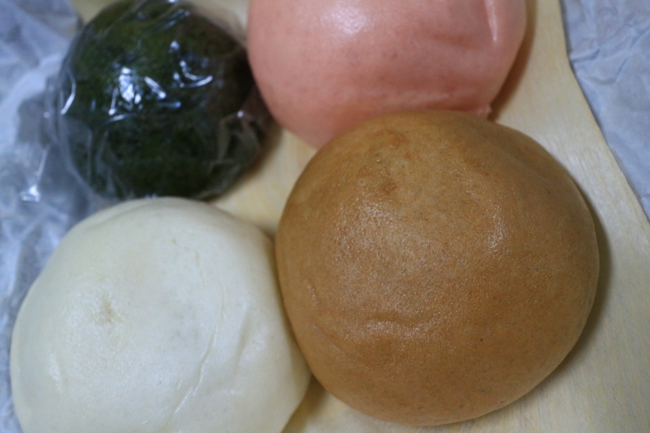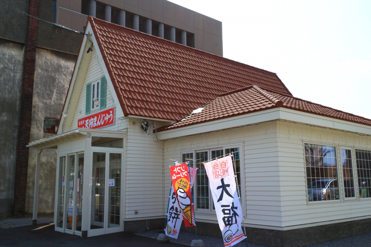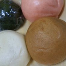 看板商品の「天狗まんじゅう」は、白・ピンク・茶の3色があり、いずれもほんのり塩気の効いたこしあんがタップリ入っています。2人で半分ずつ食べても楽しめる大きさです。
