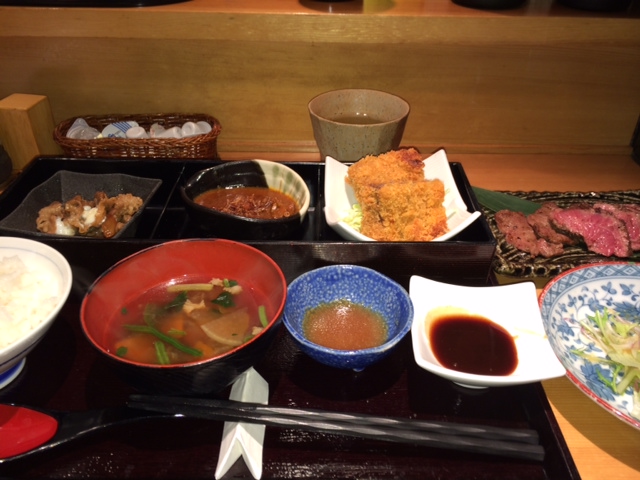 赤坂と赤坂見附からほど近い場所にある、牛タン・さがりの専門店。13時過ぎの到着で、「上遅得定食」1500円を注文。なんとこれが、さがりたん定食+お椀カレー+メンチカツ+もう一品というボリュームで、かなり苦しくなりました・・・。でも味も美味しく、内装も素敵なお店です。