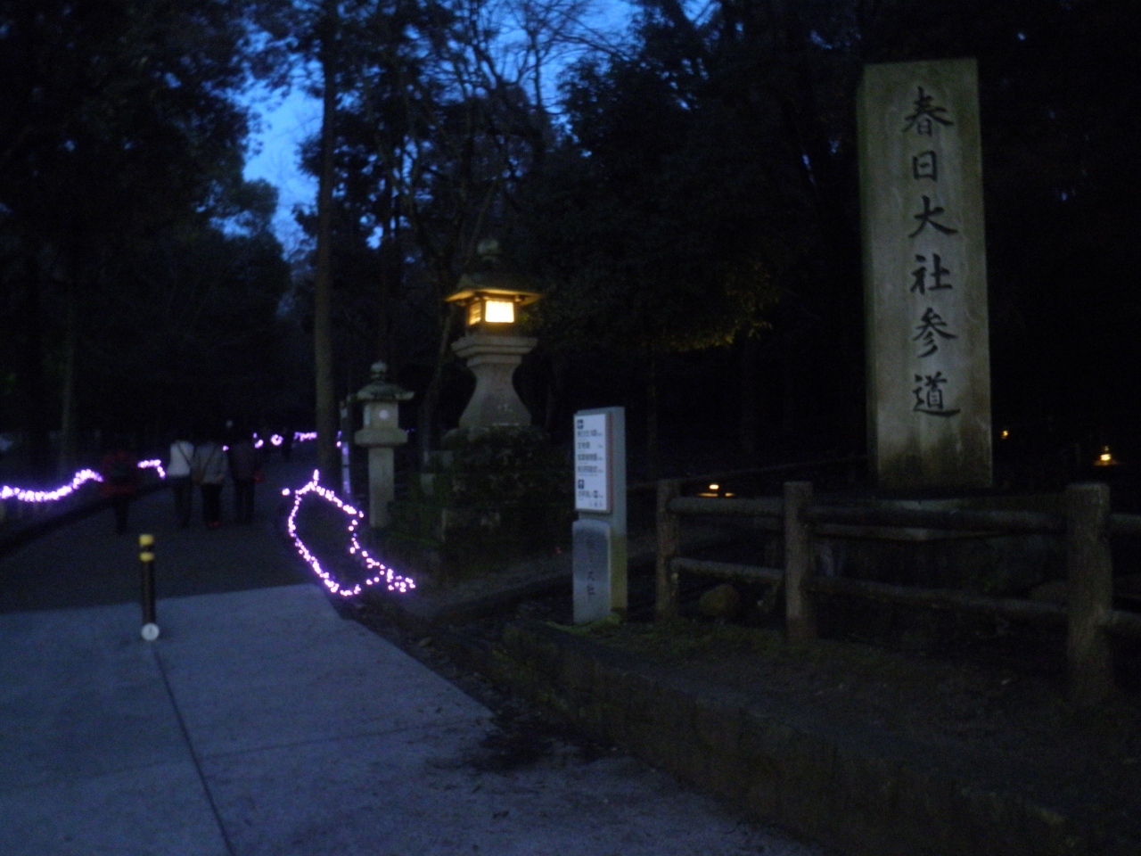 3月の下旬の夕方に東大寺に参拝したあと、春日大社にも参拝しました。 もう結構、屋外はだいぶ暗くなっていたけど、参道には人影がチラホラ見当たりました。 参道に沿って、両側がいい雰囲気に紫色にライトアップされ、灯篭にも明かりが点されていました。