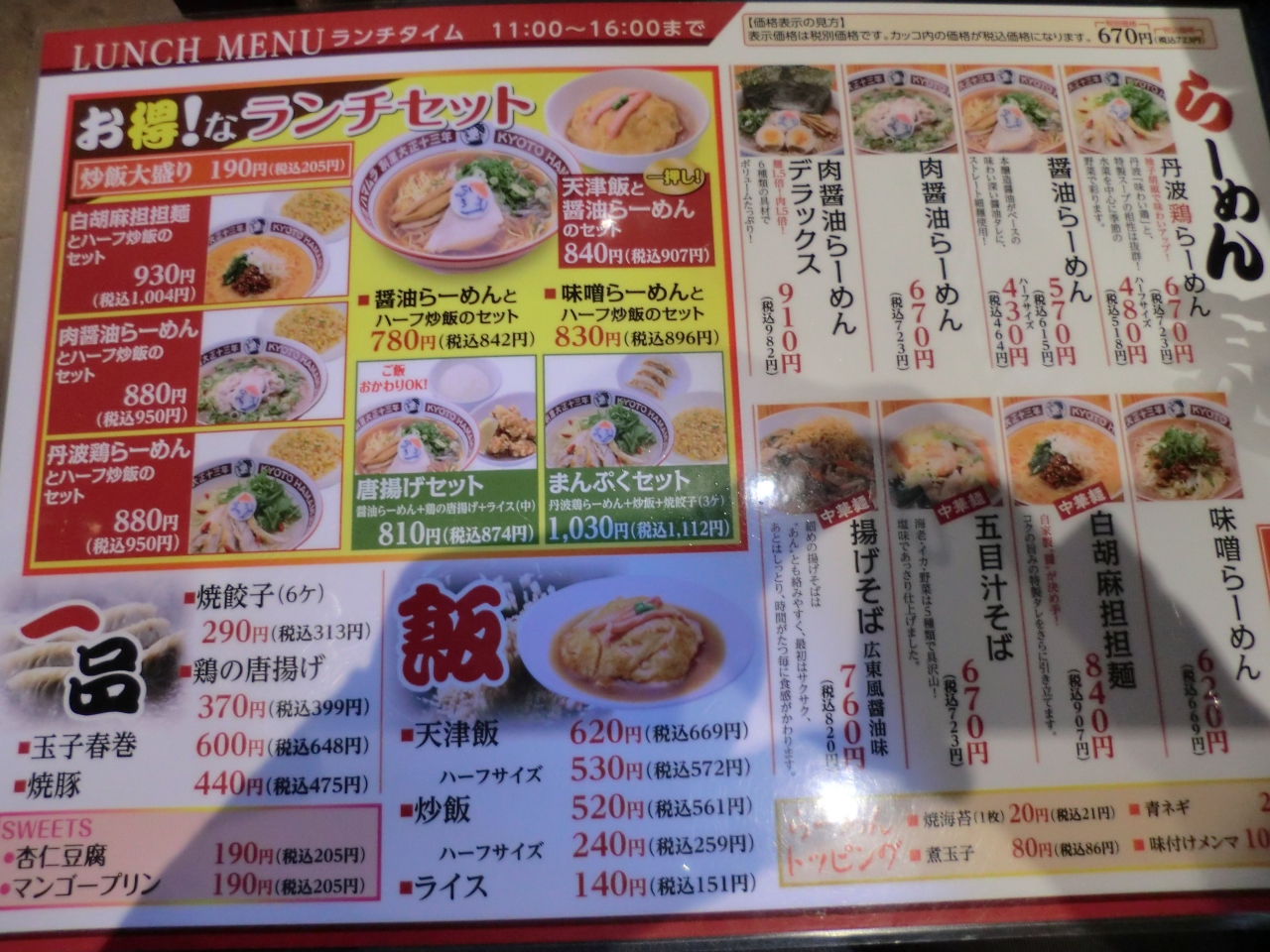 京都駅近鉄乗り場側のシッピングモールにあります。当日は丹波鶏らーめんハーフ炒飯セット、そしてデザート(マンゴープリン)と、ビール中ビンをいただきました。ずいぶん歴史ある食堂だそうです。料理が出てくるまで、あまり待ちませんでした。当日は、家族連れ、ビジネスマン、観光客等、いろいろなお客さんがいました。料理の味ですが、まあまあおいしかったです。近くにいろいろレストランがある中で、ここで食べたのは正解でした。