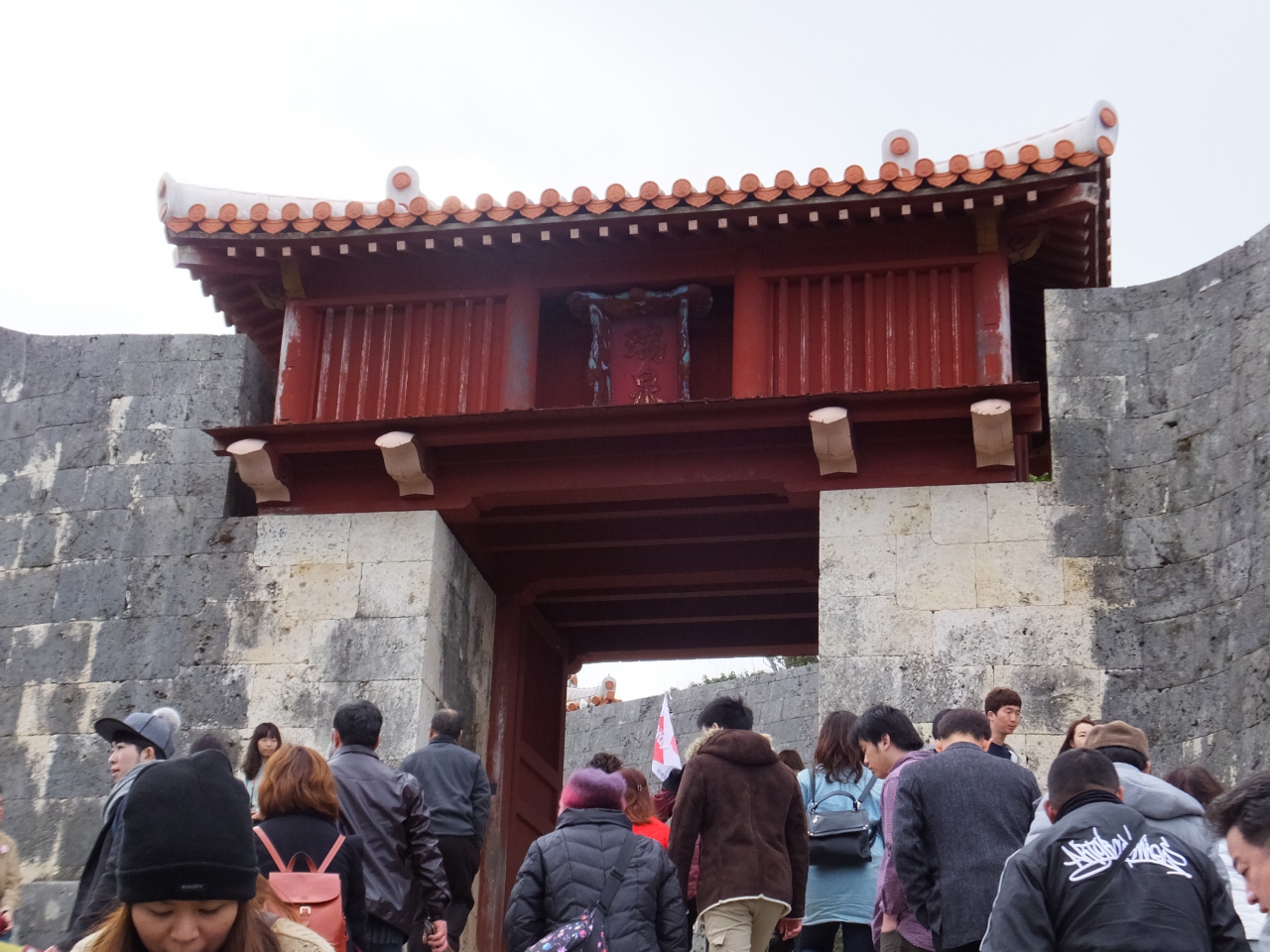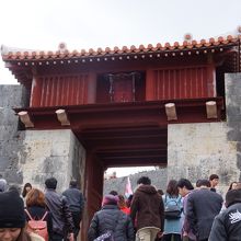 歓会門から首里城正殿を目指すと、この門に向って急に登ることになるので、門を見上げる恰好で歩いていきます。このモードが切り替わるところに龍樋があるので、見逃さないようにしましょう。道幅が狭くなるので、混雑してます。