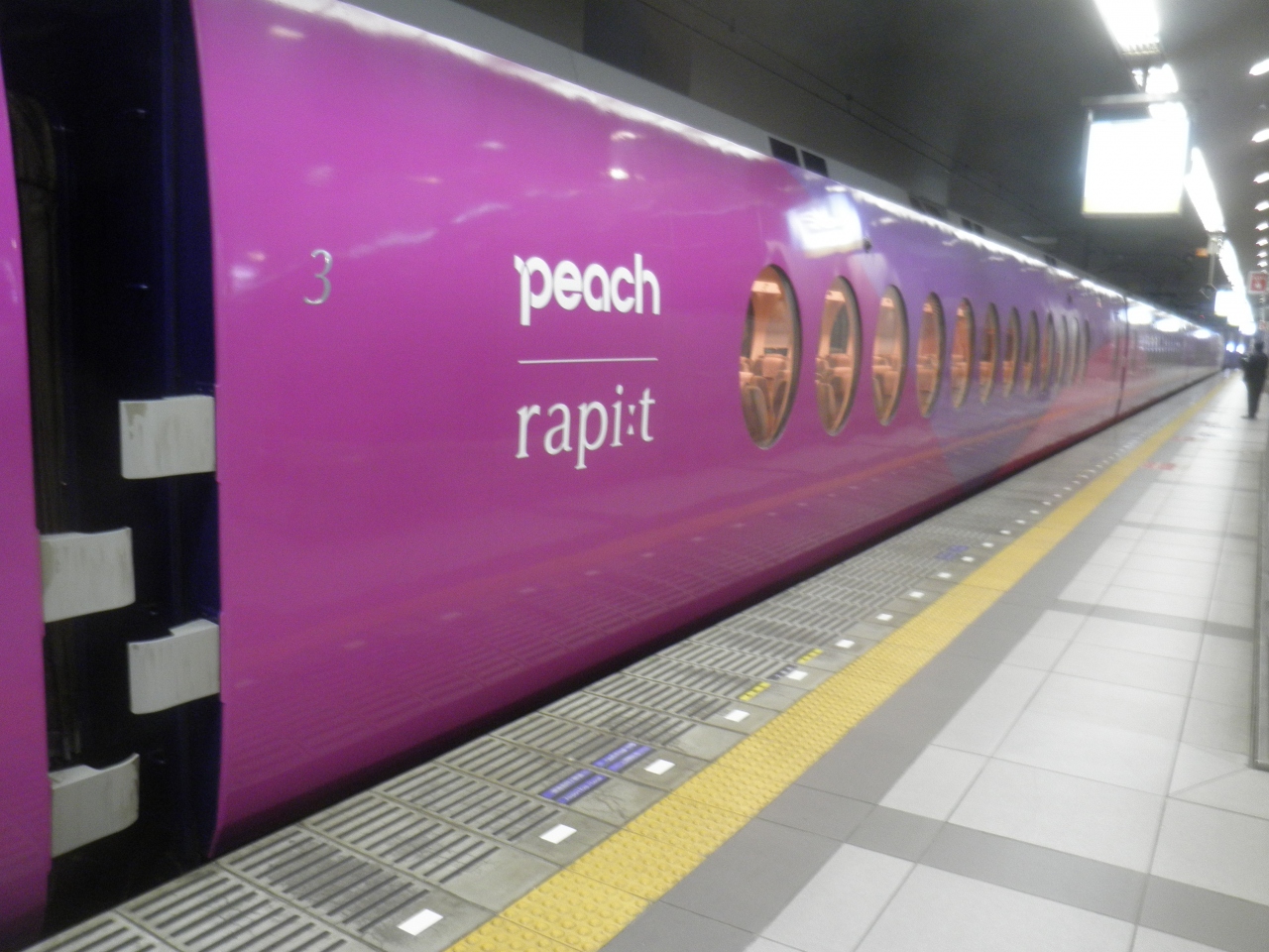 関西国際空港の旅客ターミナルは、南海電鉄とJRの駅とブリッジでつながっていて、鉄路での移動が楽です。 大阪なんばに行くときは、南海電車の特急ラピードが速くて便利です。 今回は、ピーチエアラインのピンクにペイントされた車両に乗りました。 かっこいいので楽しい気分になりました。 また、あんまり乗客は乗っていませんでした。