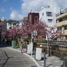 熱海銀座の近くを流れる糸川沿いに整備された、長さ数百メートルの遊歩道です。橋の欄干に虎やタコなどが埋め込まれており、早咲きの桜が植えられいます。丁度訪れた2月は桜の花が満開を迎えており、とても綺麗でした。ここの桜は早咲きで有名な河津桜よりも早く満開になるようです。
