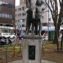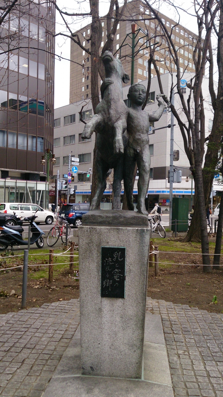 大通り公園の西3丁目エリアにある銅像で意外に小さな感じですが台座がしっかりあるので見上げる感じです。決して大きな像ではないですが、子供のとなり馬の像がが非常に躍動感がって、馬の筋肉感も良く表現されていると思います。