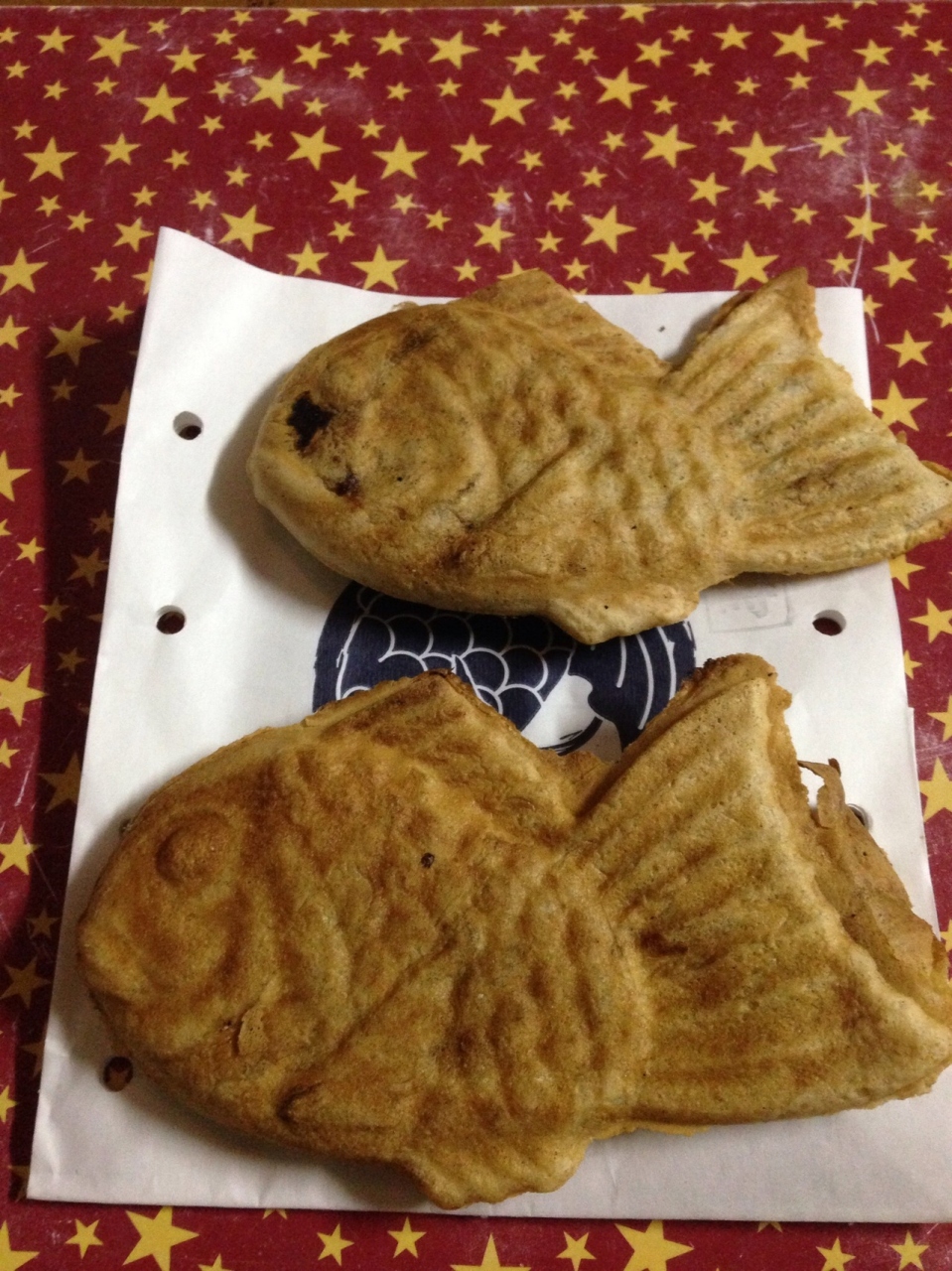 仕事帰りに久々にみかけたので買ってみました。毎度おなじみで、黒あんと鳴門金時いもをひとつずつ購入。鯛焼き一匹ずつを丁寧に焼くのが一丁焼きとゆうそうです。紙袋にも書いてありますが、水を少しかけてオーブンで焼くとサクサクしてオイシイですよ。