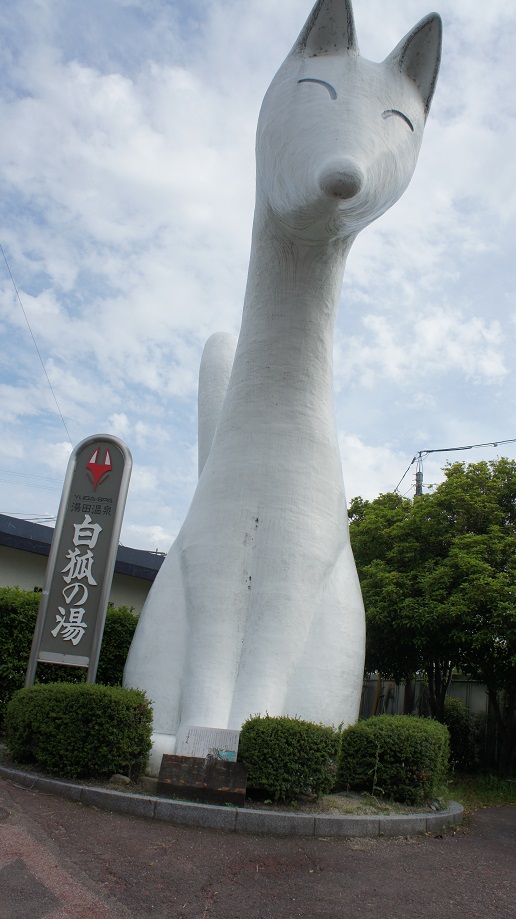 白い狐のモニュメントが出迎えてくれる。白狐がお湯を発見したという言い伝えからだ。駅から少し歩くと「湯田温泉街」、少し古くなった旅館や、モダンなホテルが建ち並ぶ。漂泊の俳人「種田山頭火」も暫く庵を結んで、西村屋という旅館に拝湯したという。