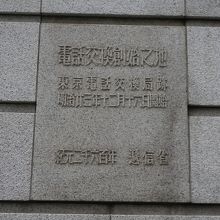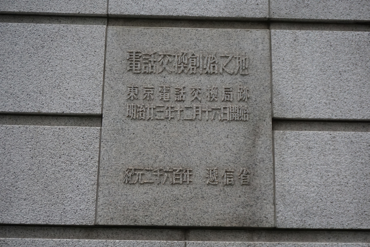電話交換創始の地は、石のプレート。日本工業倶楽部会館の東京駅側の通りに面してありました。 明治23年に交換業務が開始されたということですが、今ではもうなくなった業務。今だとコールセンターが似たような業務かもしれません。