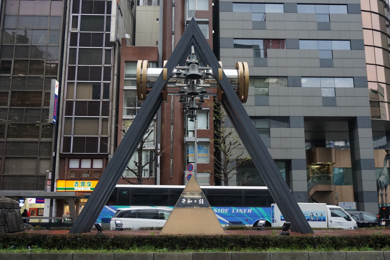 平和の鐘は、八重洲通りの中央分離帯。時間になると時を鳴らせる鐘が鳴るんですが、独特の金属音。ぎこちないカラクリ時計みたいな動きもしているので、記憶に残ってしまいます。なお、平和というのは中央区の平和都市宣言を記念する名前です。