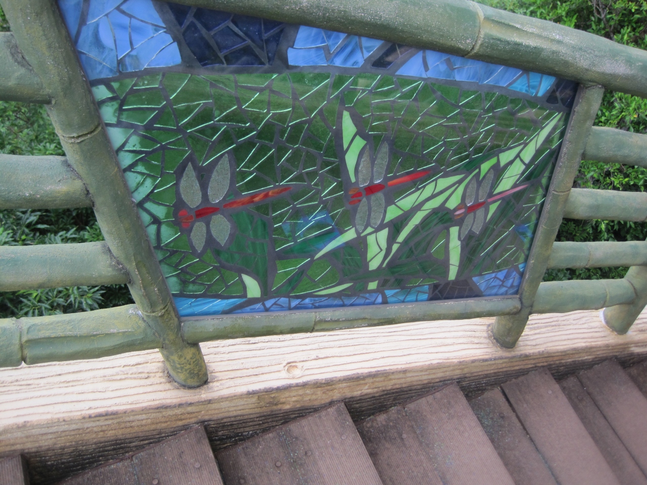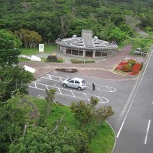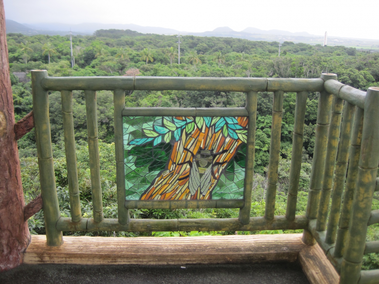 橋の近くにトイレと自動販売機があります。展望台に登ってみたら意外にも凝った展望台で、テーブルとベンチが、各階にあり、手摺りの柵には、ステンドグラスが沢山ありました。海、山どちらの景色も楽しめます。