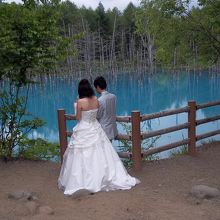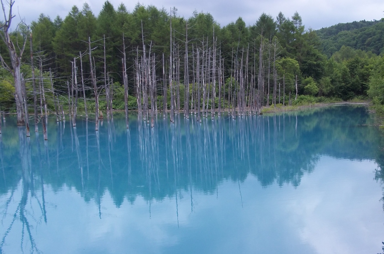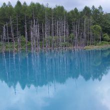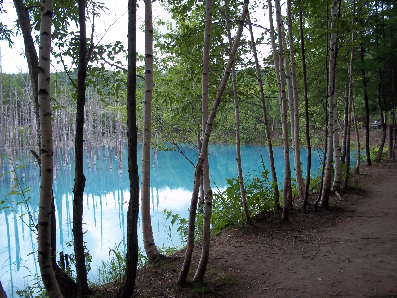 正直、あまり期待はしていなかったのですが、何とも言えない美しいブルーに驚きの声をあげました。駐車場から少し歩いて白樺の小路に入っていくのですが、美しいブルーの池と相まってロマンチックな感じでした。