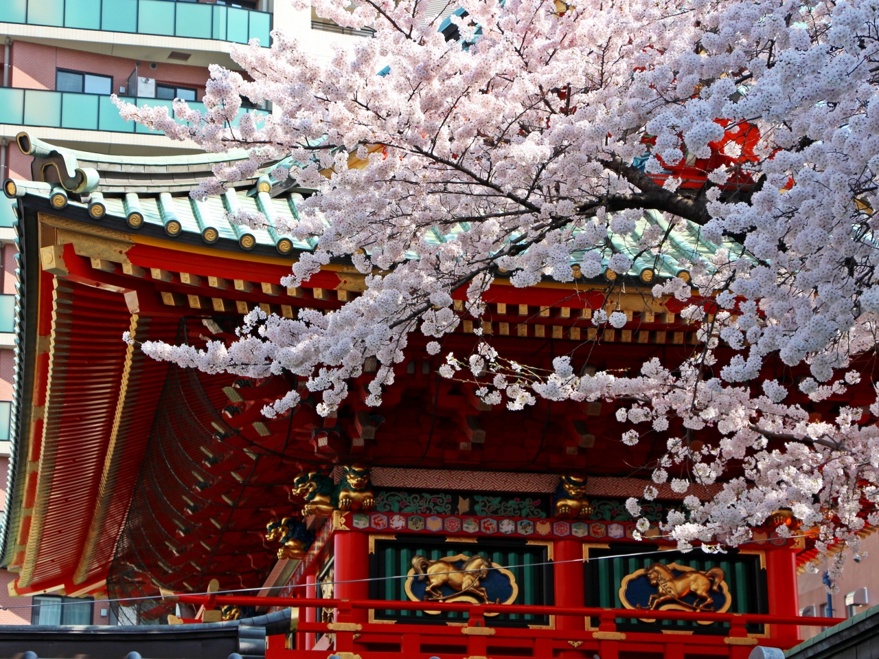 もし、桜の時期にビルの屋上から神田明神を見下ろすことが出来るならば、朱色社殿に桜の花びらが降りかかり、無機質なビル街の中の桜色のオアシスに見えるだろう。